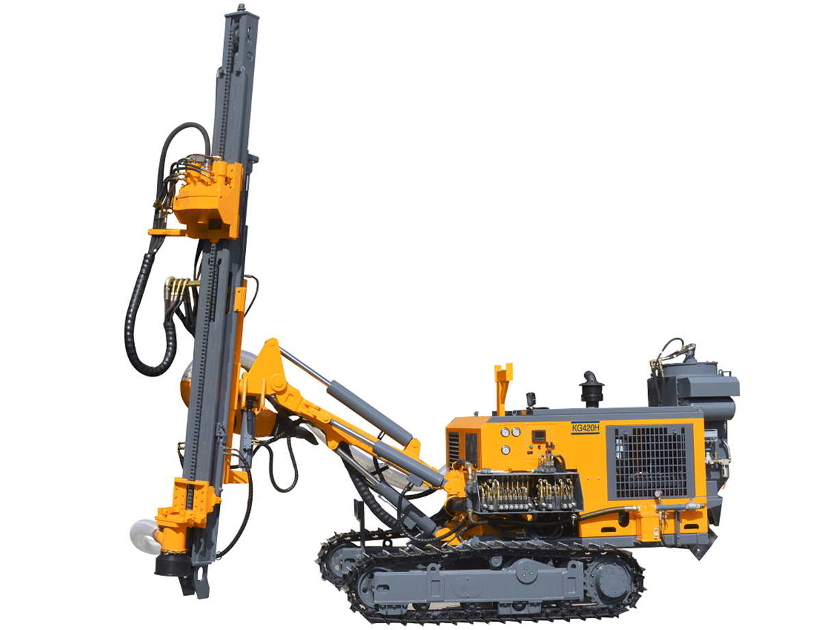KG420/KG420H型露天潛孔鉆車是應(yīng)國家對環(huán)保要求而進(jìn)行升級的一款新設(shè)備。配備玉柴四缸國三發(fā)動(dòng)機(jī),滿足國家對排放和環(huán)保的要求。采用柱塞行走馬達(dá),折邊履帶架和工程四輪一帶,提高工作壓力,增加爬坡性能。增大俯仰和舉臂油缸,滿足極限位置使用要求。同時(shí)對液壓系統(tǒng)升級,增大系統(tǒng)流量,提高回轉(zhuǎn)轉(zhuǎn)速?;剞D(zhuǎn)器采用雙馬達(dá)減速器,增大回轉(zhuǎn)扭矩和轉(zhuǎn)速。對加大提升油缸和鏈條,提高提升力和可靠性。加固導(dǎo)軌和增加滑板上下耐磨板,延長使用壽命。導(dǎo)軌采用傾斜安裝,方便操作和觀察。罩殼采用加厚型材折邊,增加強(qiáng)度和剛性,增加起吊吊環(huán),方便裝卸吊裝。