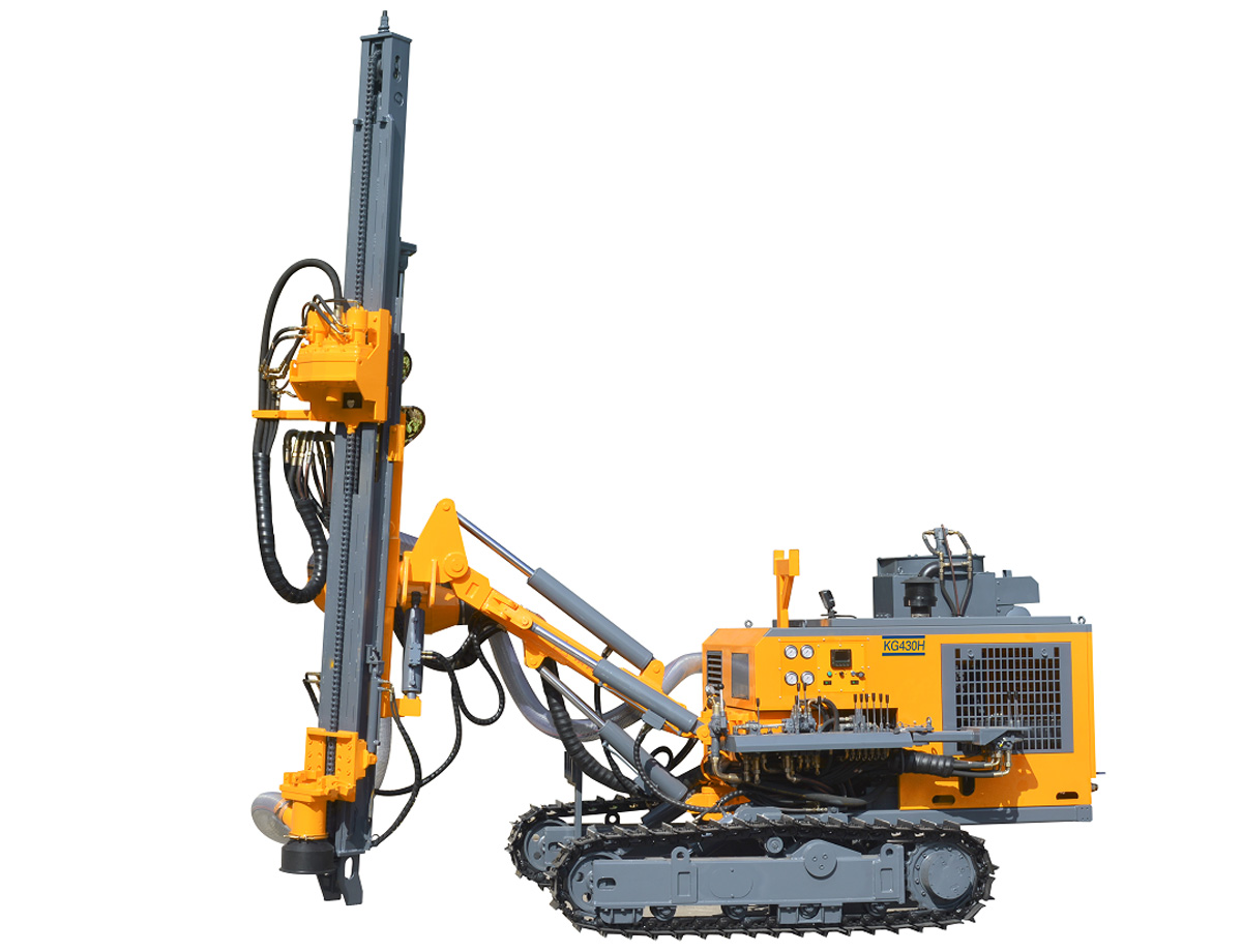 KG430S/KG430SH型露天潛孔鉆車是應國家對環(huán)保要求而進行升級的一款新設備。配備玉柴四缸國三發(fā)動機,滿足國家對排放和環(huán)保的要求。采用柱塞行走馬達,折邊履帶架和工程四輪一帶,提高工作壓力,增加爬坡性能。增大俯仰和舉臂油缸,滿足極限位置使用要求。同時對液壓系統(tǒng)升級,增大系統(tǒng)流量,提高回轉(zhuǎn)轉(zhuǎn)速?;剞D(zhuǎn)器采用雙馬達減速器,增大回轉(zhuǎn)扭矩和轉(zhuǎn)速。對加大提升油缸和鏈條,提高提升力和可靠性。加固導軌和增加滑板上下耐磨板,延長使用壽命。導軌采用傾斜安裝,方便操作和觀察。罩殼采用加厚型材折邊,增加強度和剛性,增加起吊吊環(huán),方便裝卸吊裝。