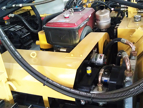 KG910C/YC910C型露天潛孔鉆車采用電動(dòng)機(jī)和柴油機(jī)聯(lián)合驅(qū)動(dòng)液壓泵為液壓系統(tǒng)提供動(dòng)力。電動(dòng)機(jī)和柴油機(jī)分開交錯(cuò)使用,在無外接電源時(shí)使用柴油機(jī),方便用戶進(jìn)行較長(zhǎng)距離移動(dòng)和轉(zhuǎn)場(chǎng);在有電源情況下使用電動(dòng)機(jī),具有安全環(huán)保,低噪聲,使用成本低的特點(diǎn)。